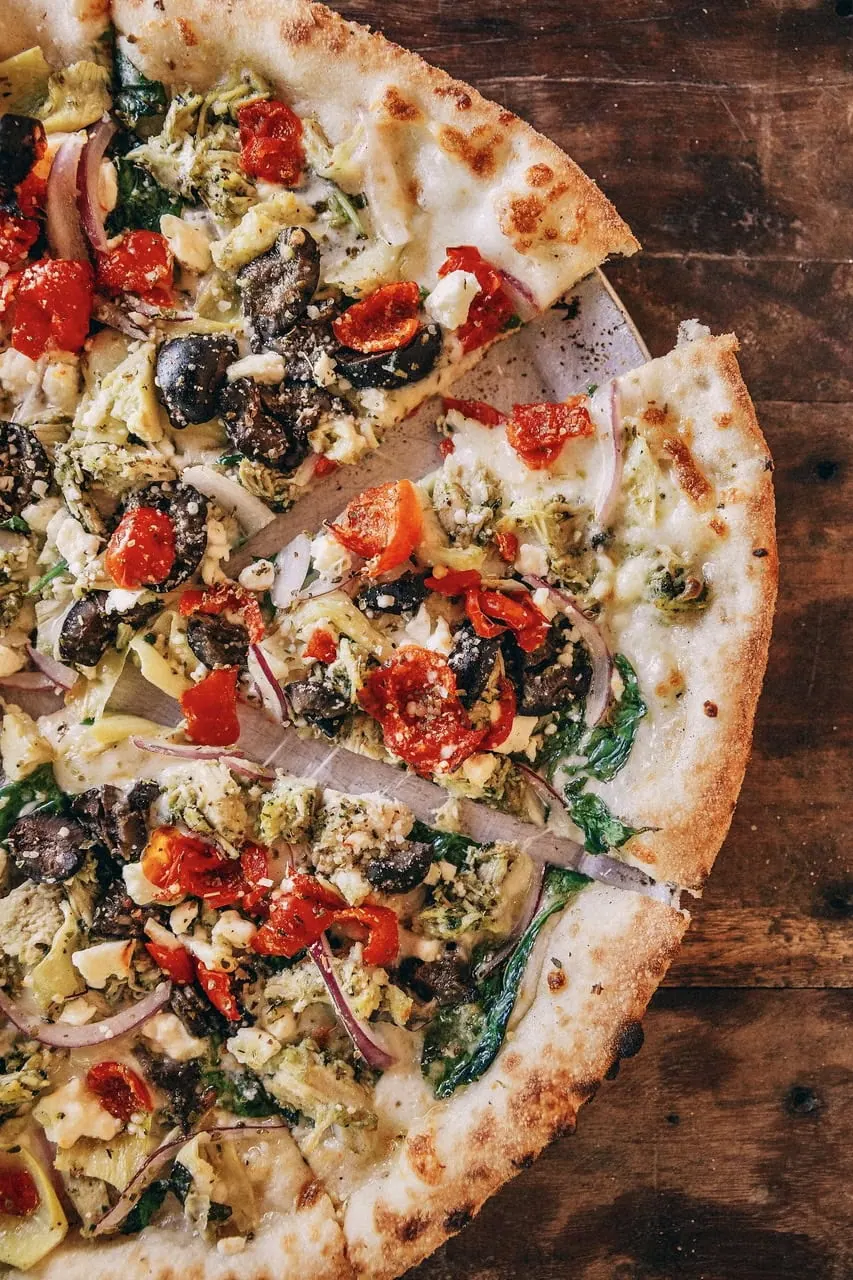 As always, we start with our handmade dough made with Italian 00 flour, then add shredded mozzarella, fresh spinach, marinated artichoke hearts, black olives, red onion, feta, and peppadew peppers.