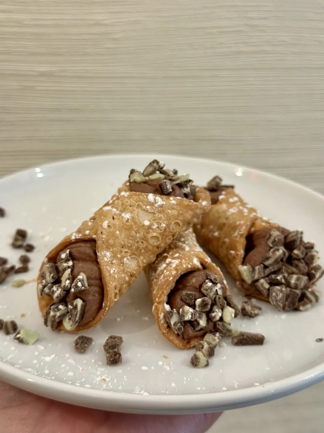 (3) mini cannolis with house-made mint chocolate cream and crushed Andes chocolate mints