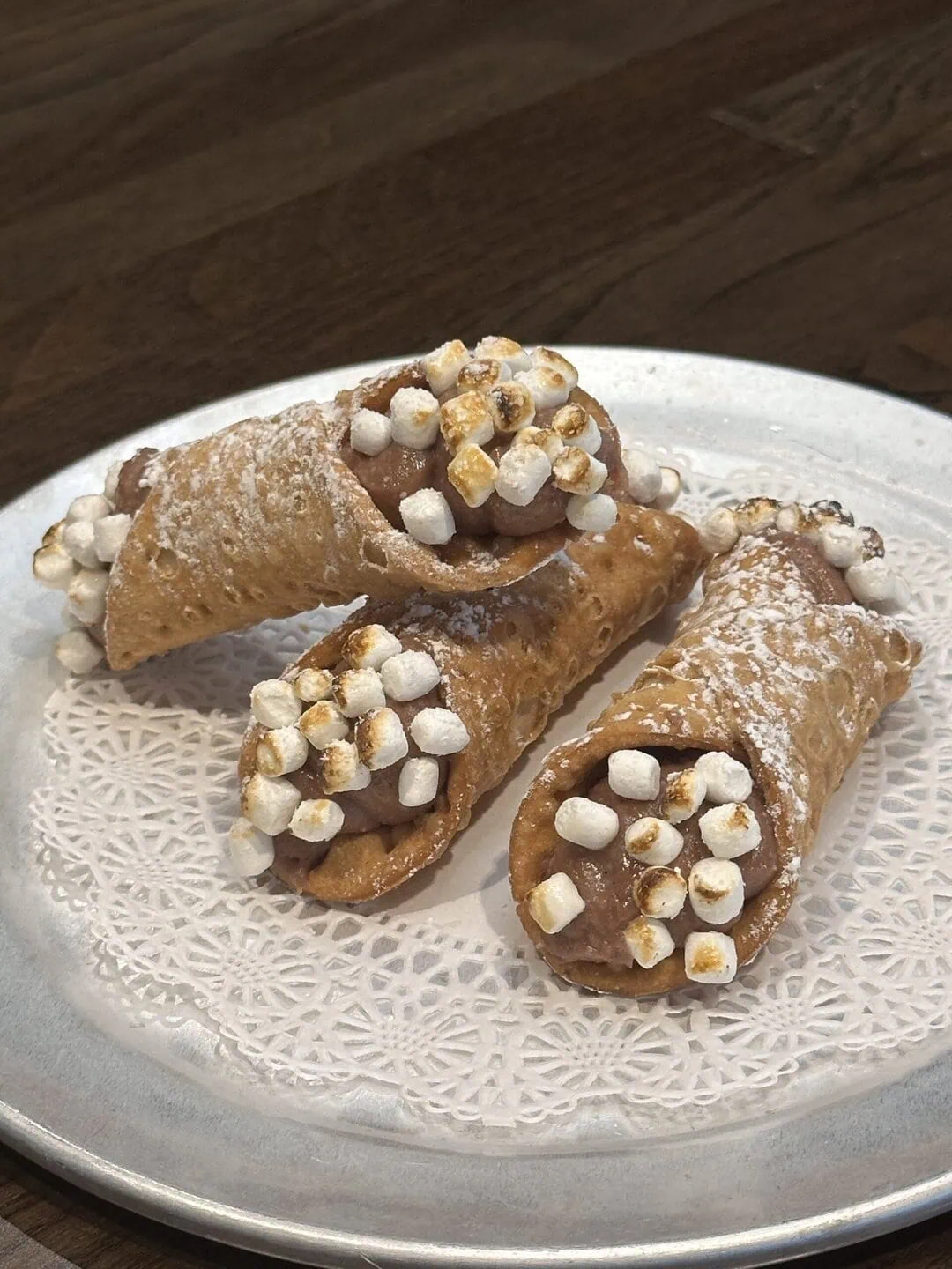 (3) mini cannolis with house-made hot cocoa cream, a hint of cinnamon, and toasted mini marshmallows.