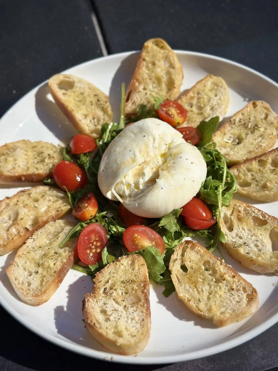 Fresh baked flatbread finished with Pecorino Romano and EVOO served with bruschetta (tomato, garlic, basil, oregano, EVOO) topped with Pecorino Romano, balsamic glaze, & basil.